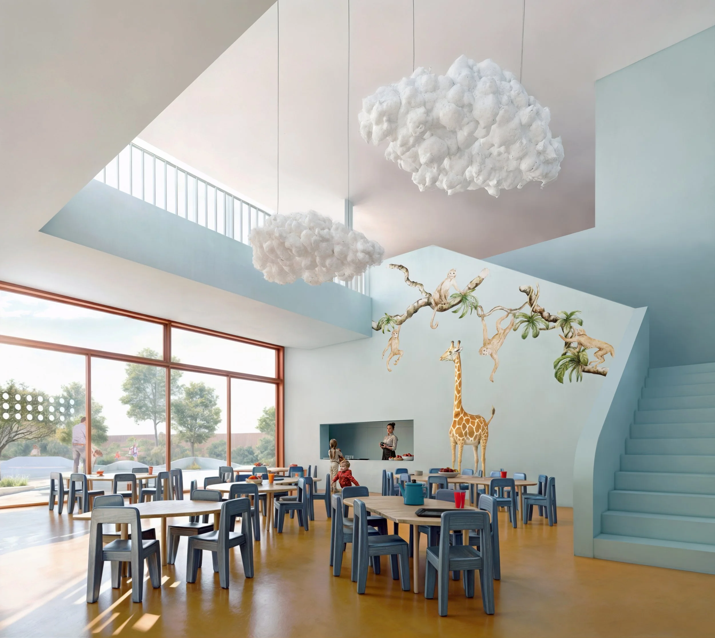 The design is composed of two L-shaped prisms, one stacked upon the other. Their positioning is key to the functionality of the new building’s complex, clearly distinguishing the outdoor areas of kindergarten and primary school. This decision forms an “embrace” that creates a protected, tranquil environment for the kindergarten, allowing the learning spaces to extend outdoors.