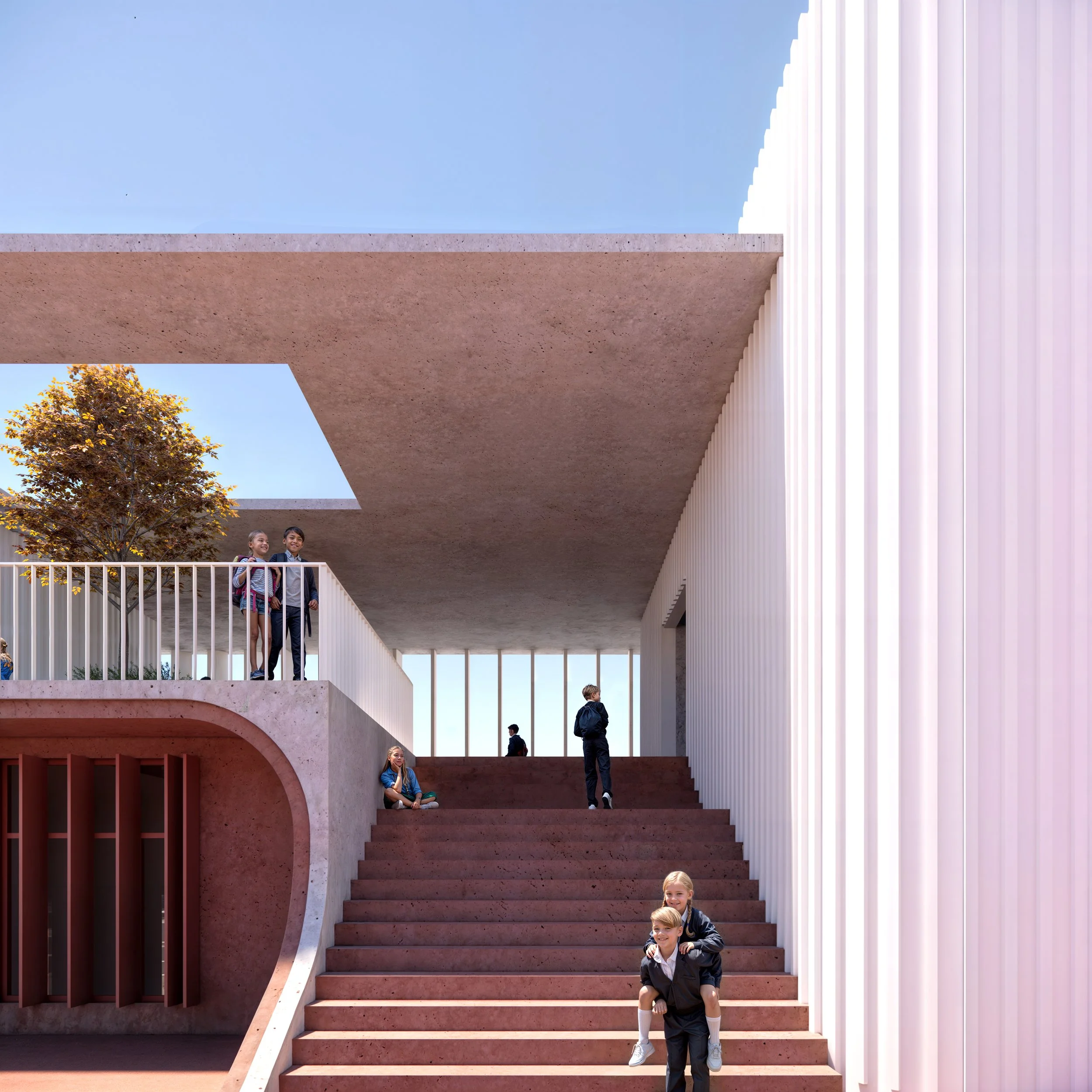 Housing the kindergarten, the lower prism of this two storey assembly is coated in a warm, earthy terracotta hue that operates as a podium for the imposing structure. The latter, contrary to its base is defined by a sinuous white envelope of vertical louvers that create a light, airy volume where indoor and small outdoor spaces intermingle, housing a series of workshop areas for the primary school.