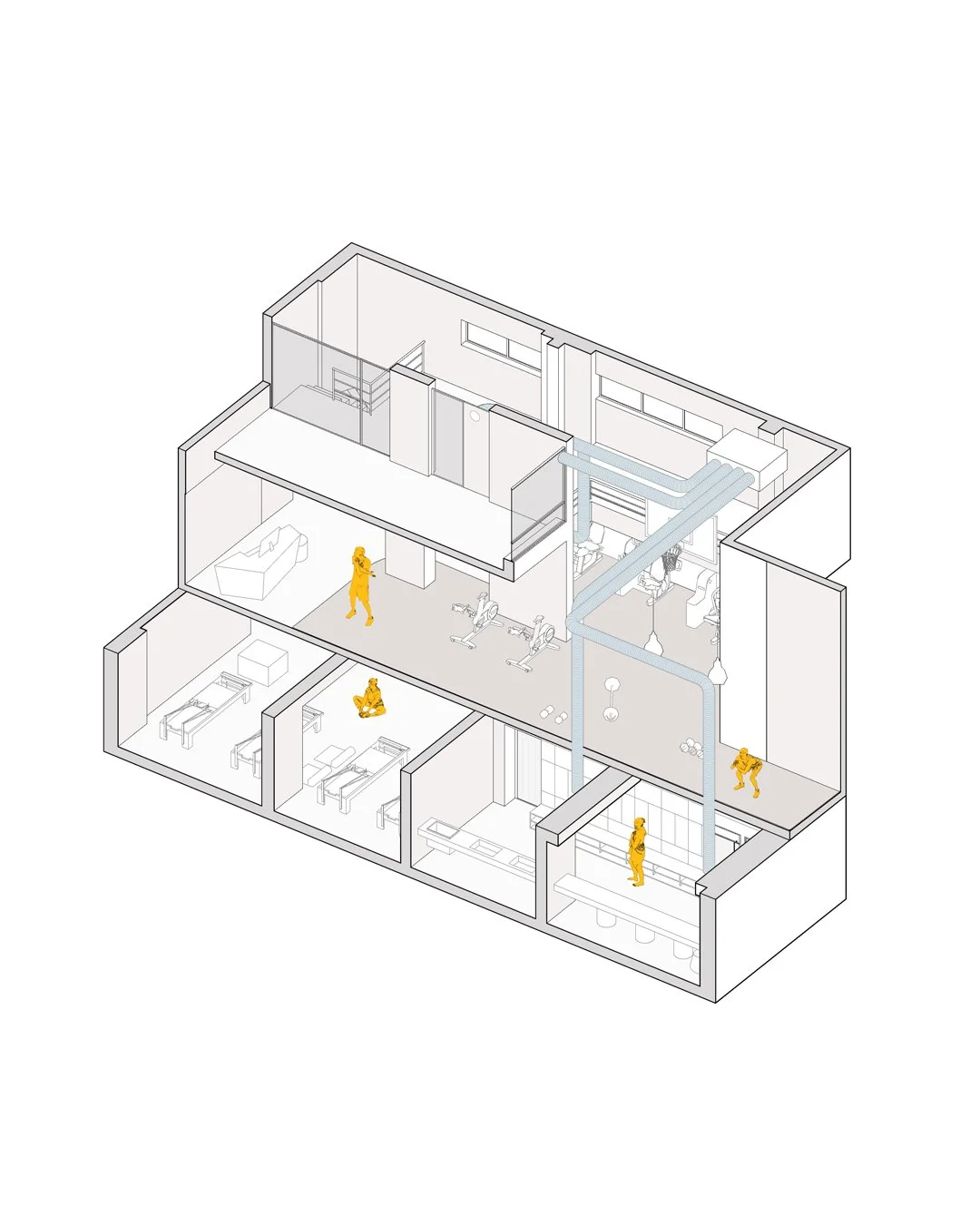 The return from the ground floor to the basement marks a shift in mood: from intensity to serenity, from exposure to introspection. By staging this contrast between two spatial “worlds,” movement, atmosphere, sound, and materiality become active participants in the visitors' experience through the gym.