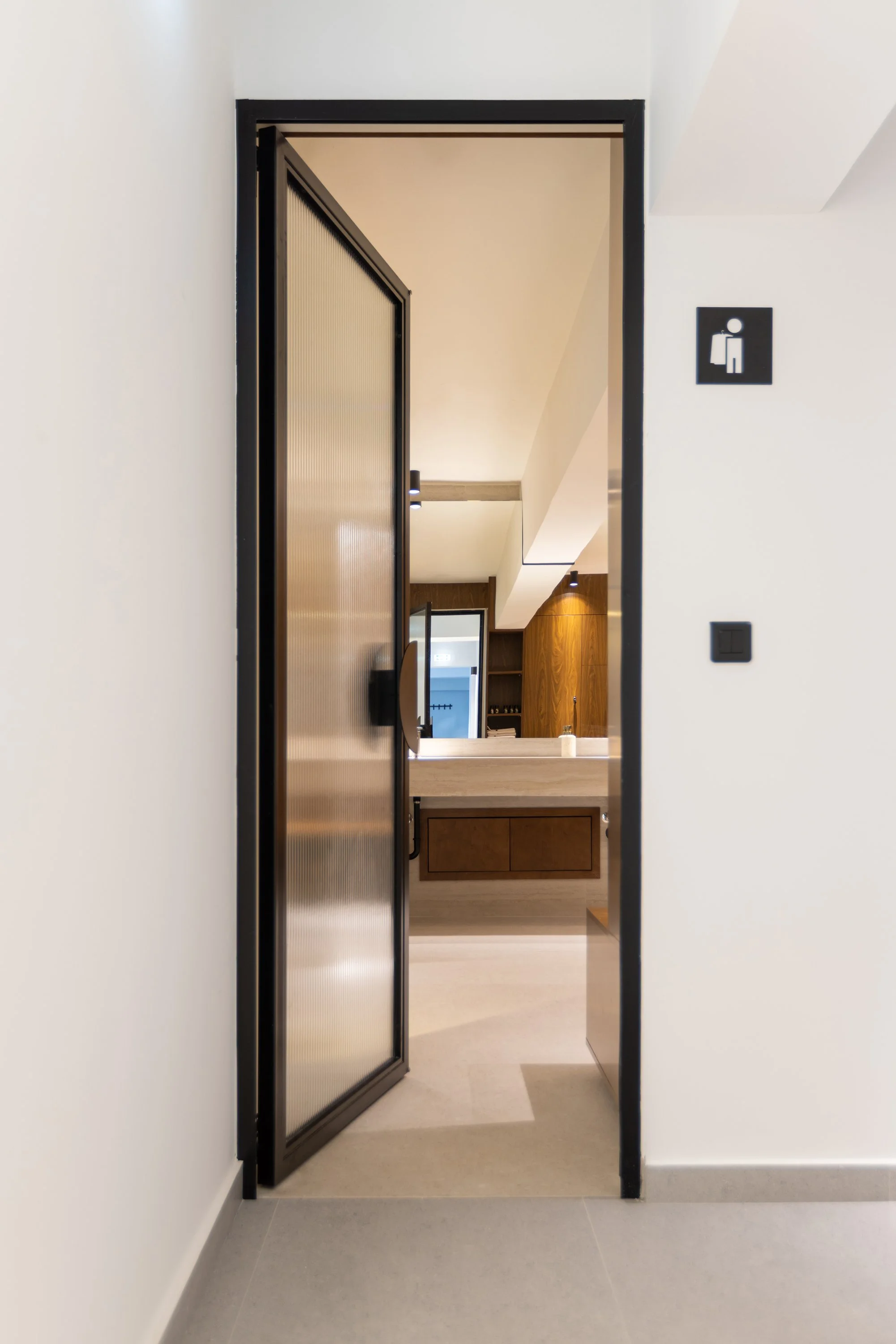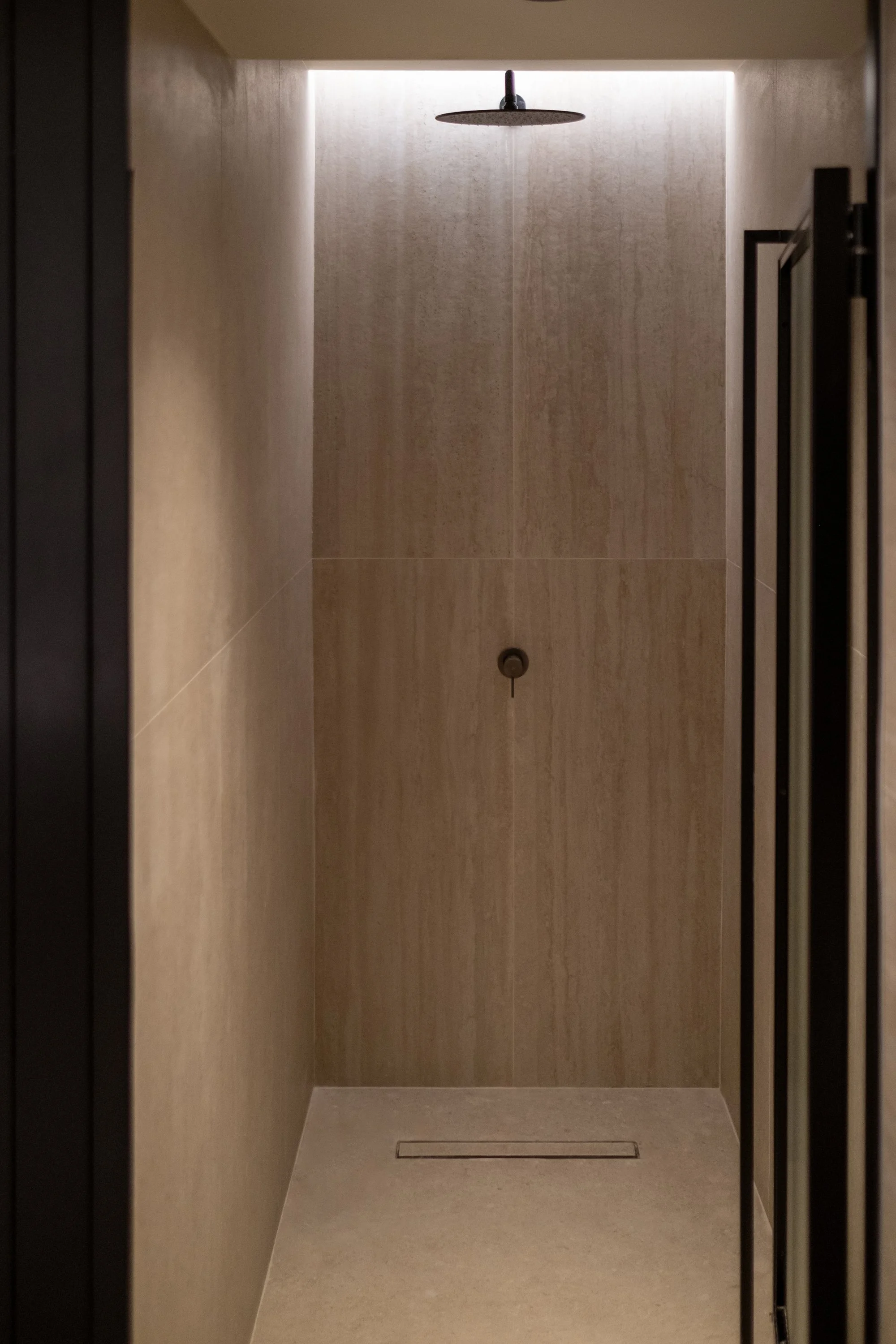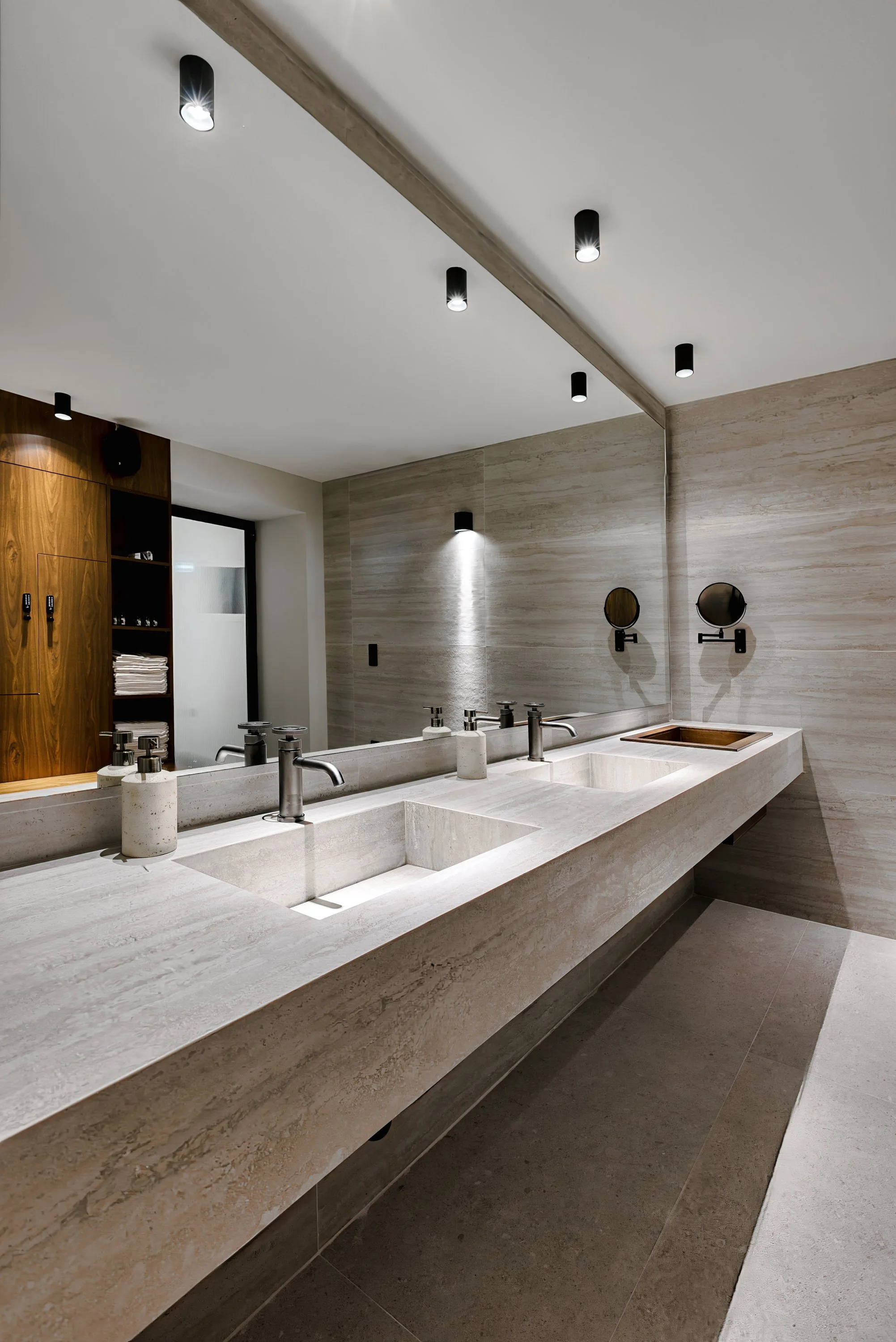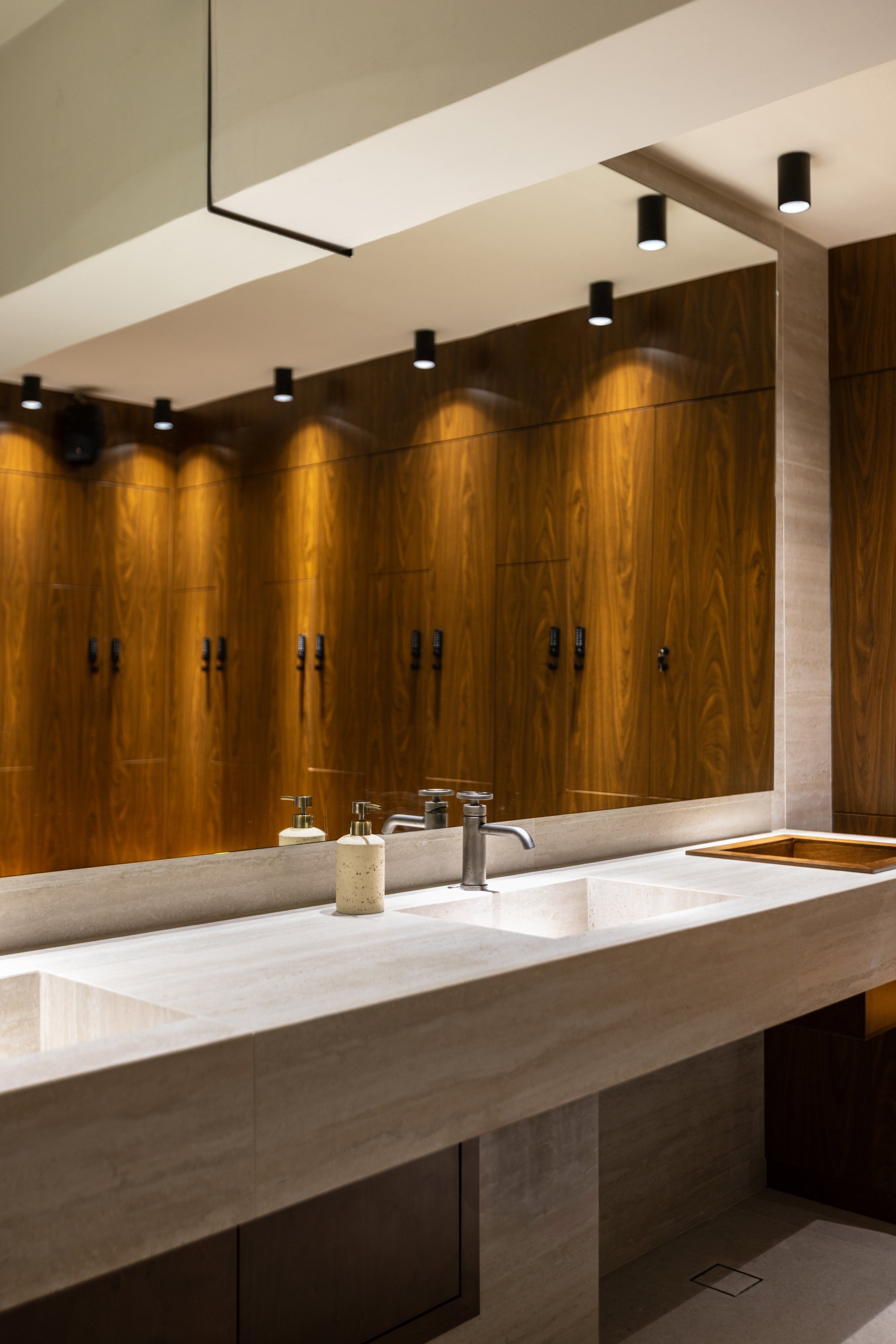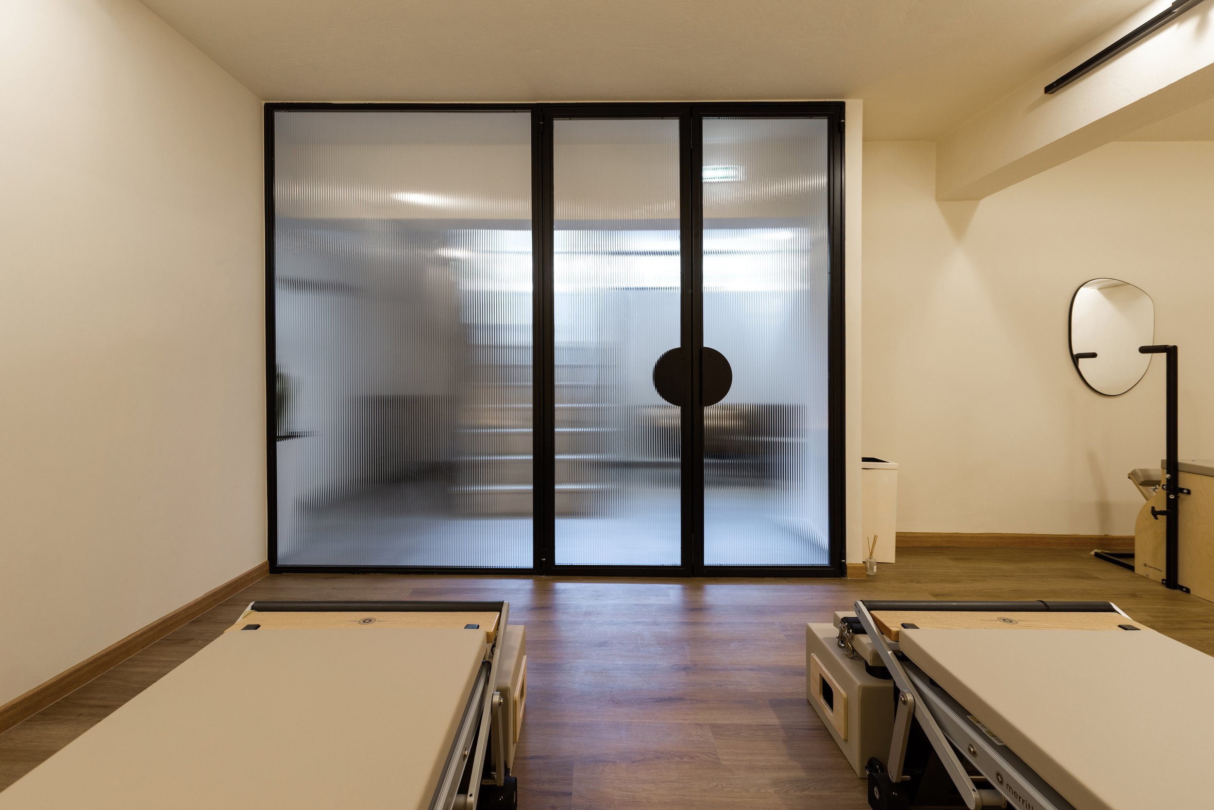 The lower level, enclosed and oriented toward the building’s courtyard, hosts a Pilates studio, changing rooms, and wet areas. It serves as a zone of preparation, where movement is gentle and deliberate, designed to release the weight of daily routine. Warm materials, earthy tones, and subdued lighting create an atmosphere of calm and well-being, encouraging visitors to slow down.