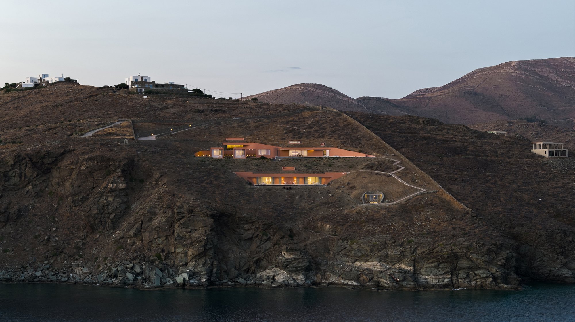At the lowest level, in immediate proximity to the sea, lies the Point: an independent subterranean guesthouse, isolated and invisible to all. At the Point, one can pause, listen to the serenity of nature and the sound of the waves. With the intent to disappear, the building is constructed from materials sourced on-site. Only the circular terrace remains visible — a plateau towards the Aegean.
